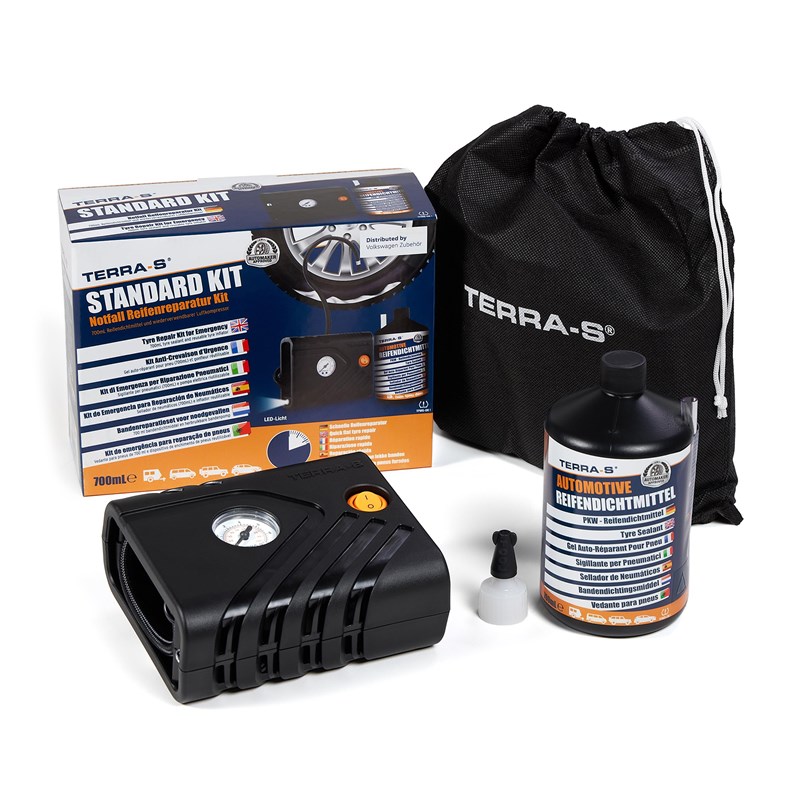 Original VW punkteringssæt med luftkompressor og 700 ml tætningsmiddel
